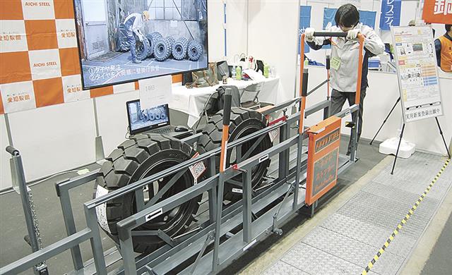 愛知製鋼はフォークリフトの予備用タイヤをてこと重力で入荷順に取り出し易くした装置などを紹介した