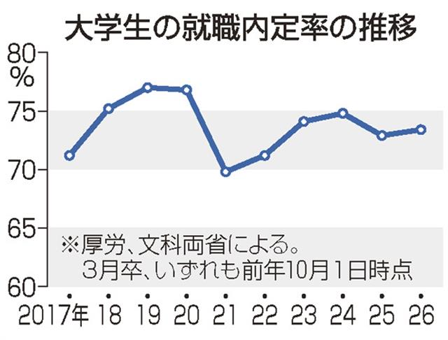 厚生労働、文部科学両省は14日、来春卒業予定で就職を希望する大学生の10月1日時点の内定率が、前年...