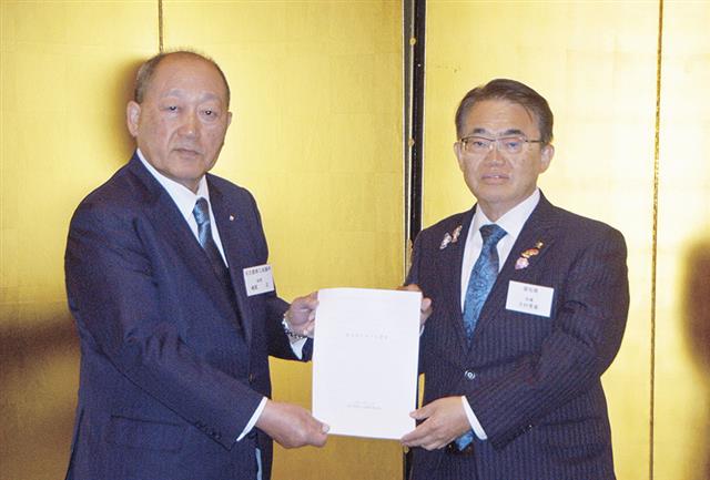 大村知事(右)に要望書を手渡す嶋尾会頭