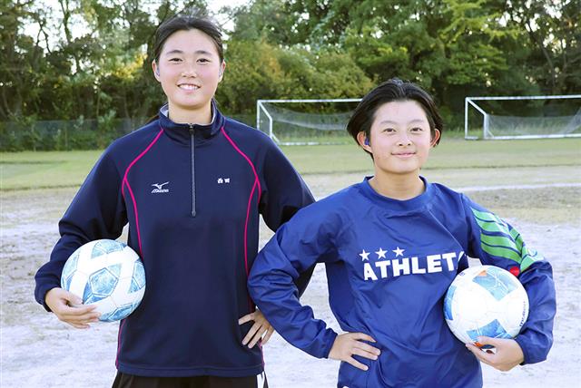デフリンピック女子サッカー日本代表の西田波琉(左)と榊原莉桜香=10月、名古屋市
