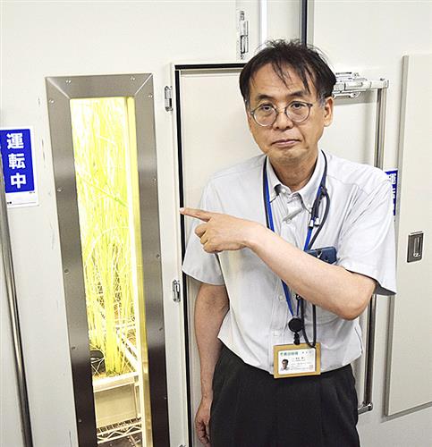農研機構の「ロボティクス人工気象室」で、今世紀末を模した環境で栽培中のイネを示す米丸淳一ラボ長=8月、茨城県つくば市