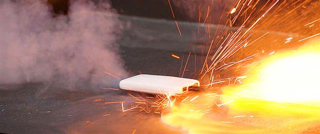 リチウムイオン電池を使ったモバイルバッテリーの発火実験の様子(製品評価技術基盤機構提供)